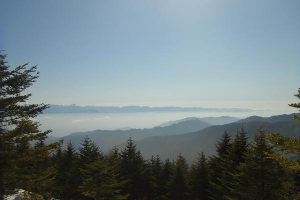 遠くから見ると山頂まで木で覆われているため、展望は期待できないかなと思っていましたが、尾根にでると中央アルプスから南アルプス、遠くには八ヶ岳まで見渡せました。