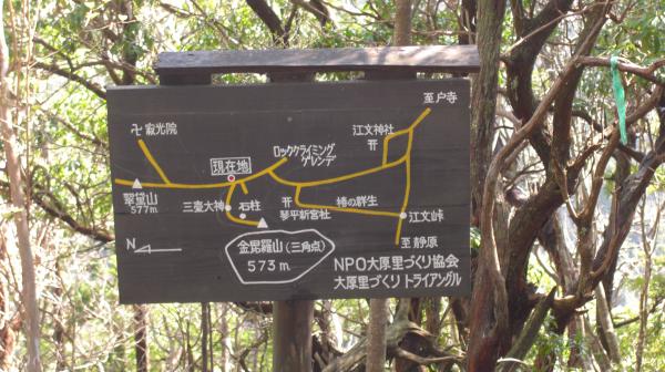 - 江文神社登山口(35分)金比羅山クライミングゲレンデ分岐(15分)クライミングゲレンデ(10分)金比羅山三角点(45分)翠黛山(60分)焼杉山(60分)阿弥陀寺