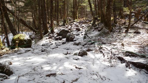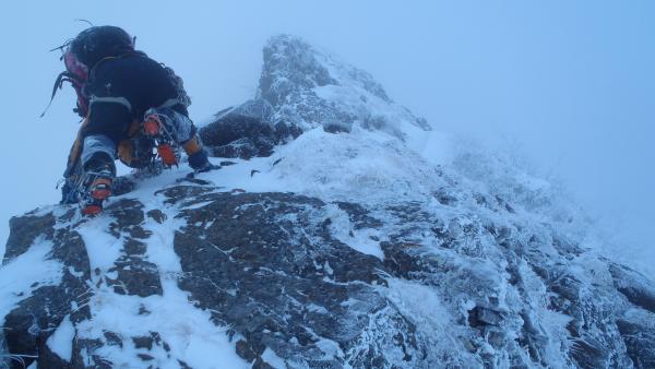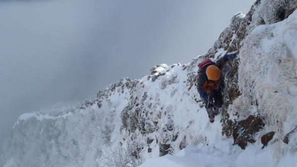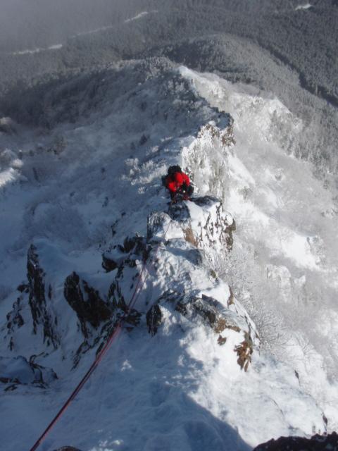 - 美濃戸山荘までは車で通行可。美濃戸口から北西稜下部までは樹林帯内の一般登山道だが、概ね積雪に覆われており、下りでは特に軽アイゼンぐらいは必要。上部はまだまだ冬山装備が必要。今回は寒気が入っていたこともあり、かなり寒かった。北西稜へのアプローチは見通しの悪い樹林帯となり、視界が悪い時などは間違いやすいようだ。北西稜は残置支点もそれなりにあるが、古いものもあり全面的に信用は出来ない。登り応えのある好ルート。