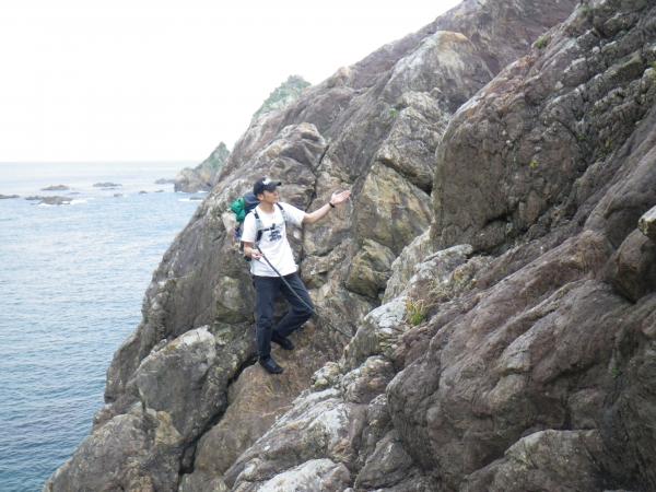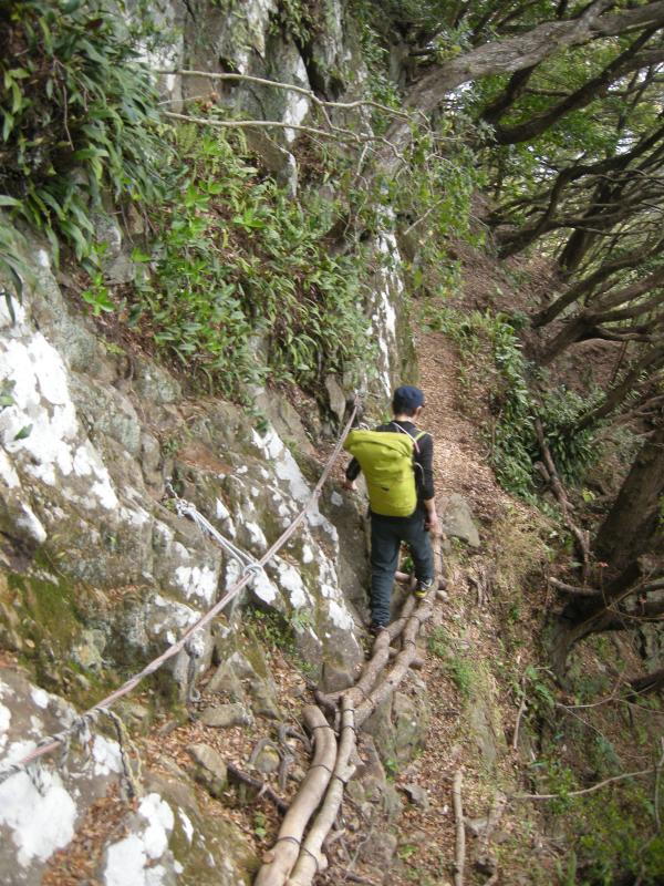 休憩所からは林道から外れて岩場までトラバース。崖が切れ落ちており、所どこにロープが張ってあります。展望が開けたところから海に向かって左手側に下って行くと、朽ちかけたロープが岩の裂け目から覗いており、そこがケイブの入り口になります。