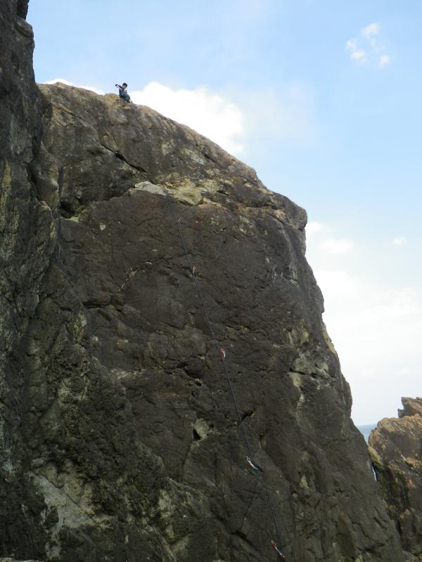しかしクライミングとなると対照的で、打ち付ける波の轟音がケイブにこだます中での迫力あるものとなります。ケイブの外のルートも、高度感バツグンの海岸ルート。登攀中にふり返ればそこは太平洋というロケーションです。