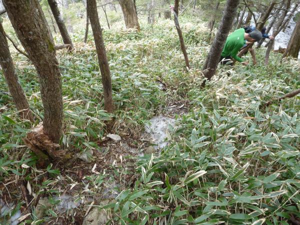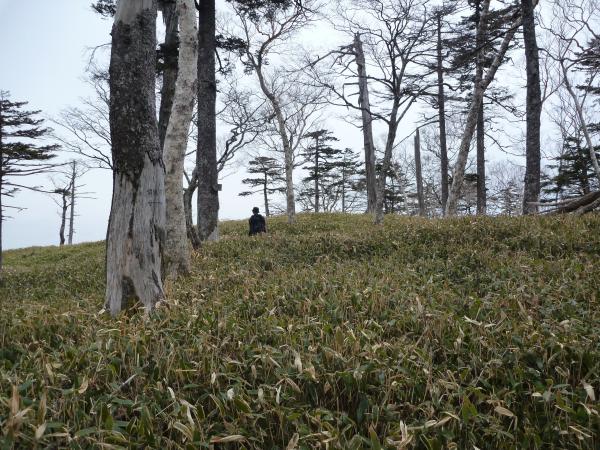 バラ谷の頭の山頂手前には、凍りついた残雪もあったので、滑らないように慎重に通過しましょう。アイゼンを使うには至らないと思いましたが、笹の下に雪が隠れている箇所もあり、足元が見えづらいので、特に注意が必要です。