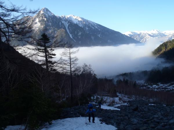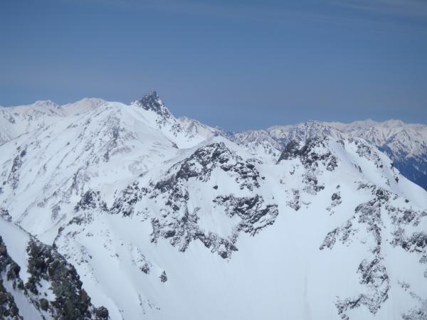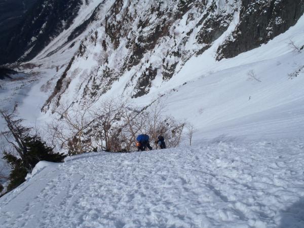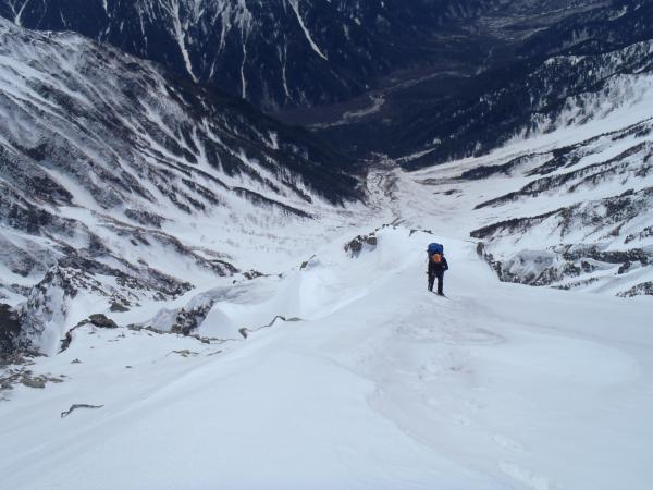 トリコニーの岩場以外はほぼ雪稜、雪壁の構成で奥穂高へ突き上げることのできる良いルートです。