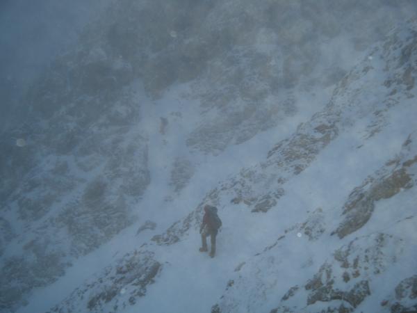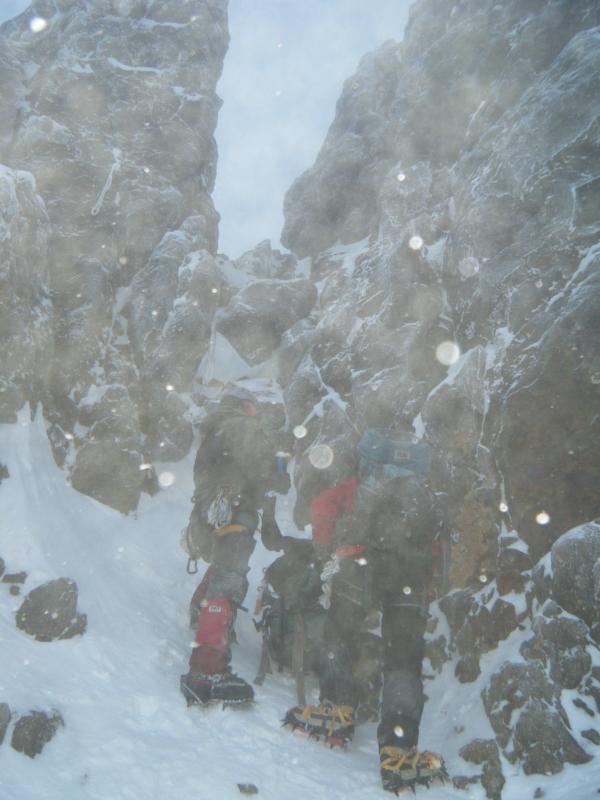 朝から雪。天気を見ながら文三郎道を登って赤岳主稜の取り付きに着くも、