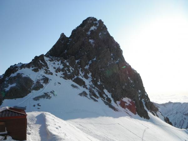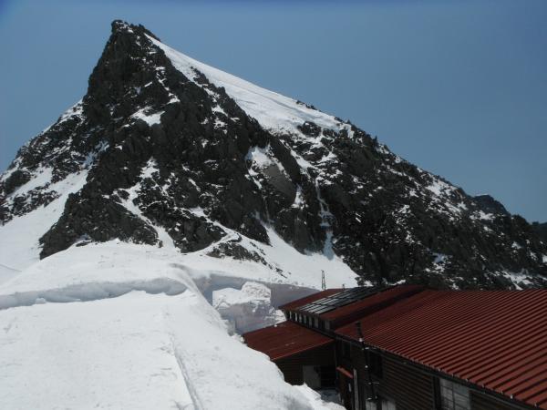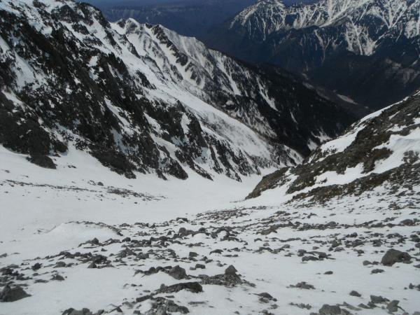 2日目、起きると風はぼちぼち吹いていますが、快晴です。今日は涸沢まで下りますが、槍沢の雪質は昨日の強風の影響もあってかガッチガチ。アイゼンのフロントポイントだけ刺さるような状態です。雪が緩むのを待つのと、ウォーミングアップを兼ねて槍ヶ岳を往復し、その後小屋に戻ってのんびりし、2時間後、再び槍沢の状態を見ると、まだ固い。ただ、さっきよりはいけるかも。ということで滑降開始。スリル満点、転んだらアウトです。慎重に滑り、天狗原までトラバースしていきました。