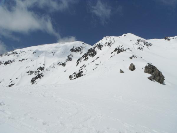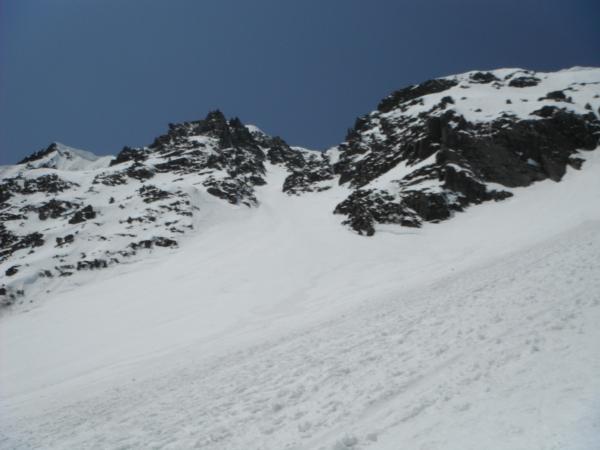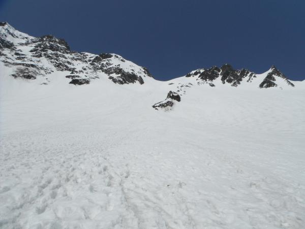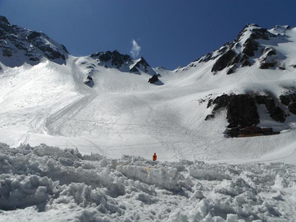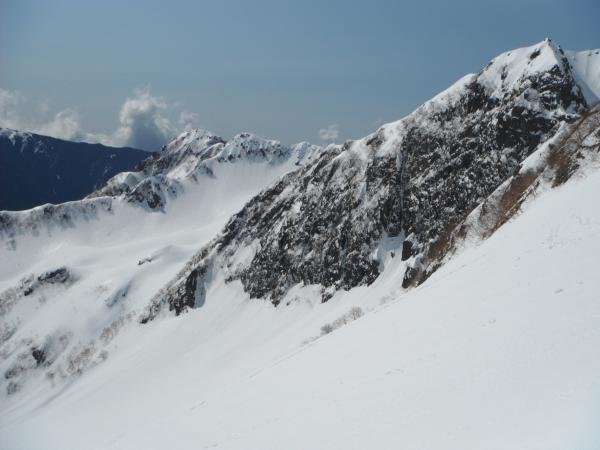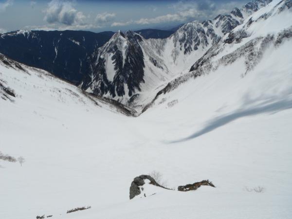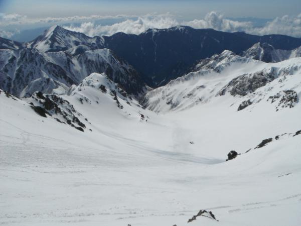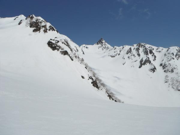 横尾本谷右股…快適なザラメ斜面でデブリも少ない。
