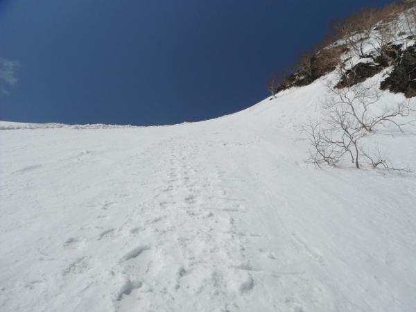 ザイテングラート・小豆沢…遠くから見ると雪崩の後かと思えるくらいのトレースが残っている。