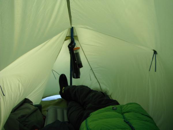 初日は槍ヶ岳までひたすら登り。テント泊装備を背負っての登りはかなりきつく、特に飛騨沢上部、槍ヶ岳山荘が見えてからは非常に長く感じました。飛騨沢の広大な斜面を颯爽と滑って行くスキーヤーを見ると、一緒に滑ってしまいたい気分になりますが、はやる気持ちを抑えてひたすら登ります。天気が良かったことが幸いでした。