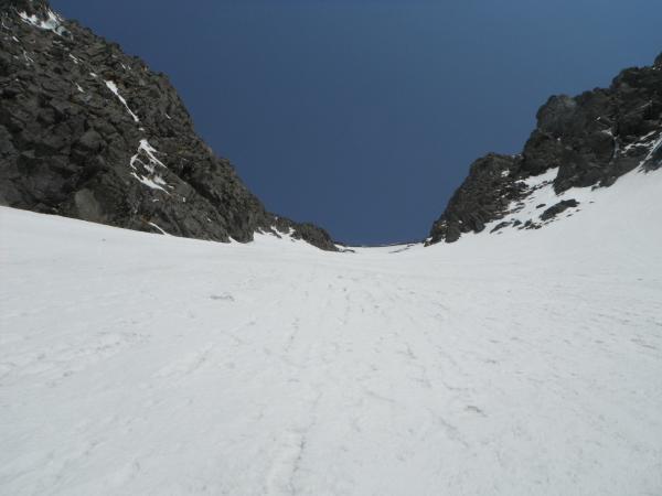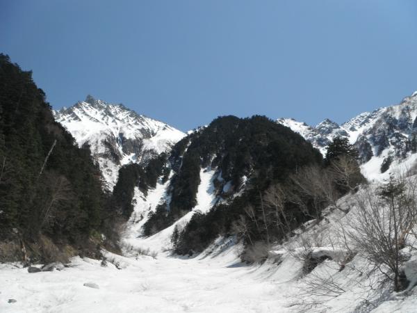 槍沢…9時に滑降を開始したがカリカリのアイスバーンで恐怖を感じた。時間に余裕があるなら雪がゆるむのを待つべき。