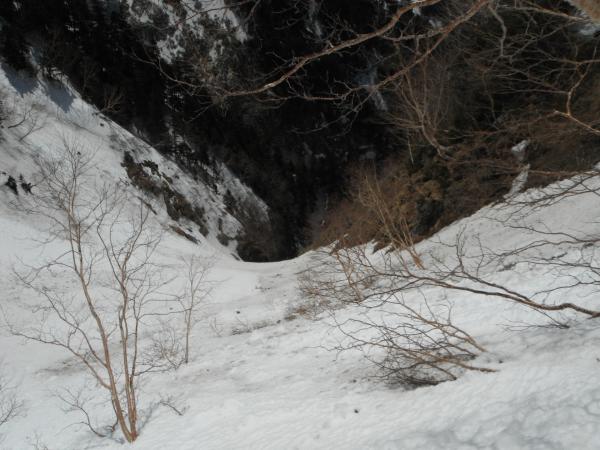 白出沢…全体的に狭いのでサイドからの雪崩や落石に注意。白出大滝の巻道は荷継沢を合わせてすぐにある。巻道もかなりの急斜面なので滑落に注意が必要。沢をそのまま直進すると堰が3つある。1つ目は雪が下までつながっていてそのまま下れるが、残り2つは巻く必要がある。