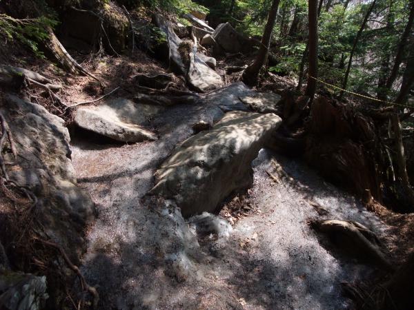 - ○六合目の先、樹林で日陰になっている地面はアイスバーンでカチカチに固まっています。注意が必要です。