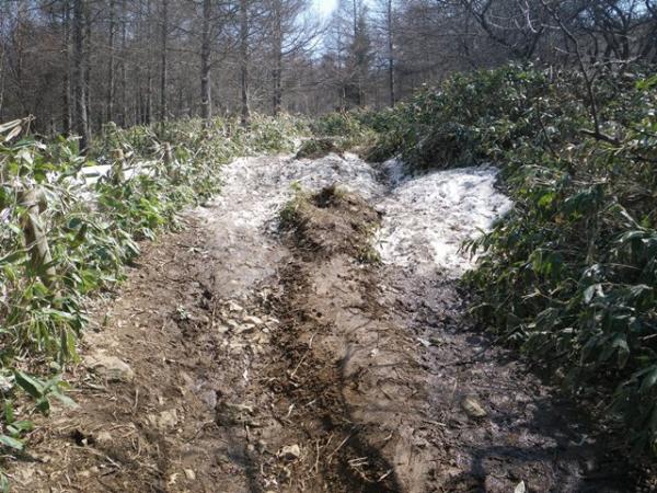- 綺麗に整備された登山道です。山頂近くで残雪が残っていました トレッキングシューズなら問題ないと思います。滑ると泥だらけですが。。。