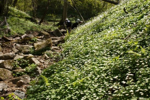 河内長野駅からバスに乗り、金剛登山口へ。林道歩きから登山スタートです。しばらく歩き、カトラ谷に入ります。少し荒れた道を進み、梯子を登り、岩場を越えるとイチリンソウの咲くお花畑に着きました。花を愛でる心を忘れ、一心不乱に写真を撮った後は山頂へ。