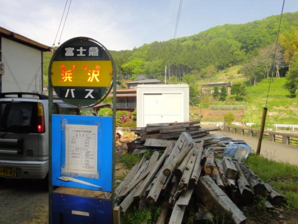 JR上野原駅からバスで揺られること50分(実質的に使えるバスが一日一本という、時間に拘束される便)。浜沢バス停に到着です。ここからスタート。