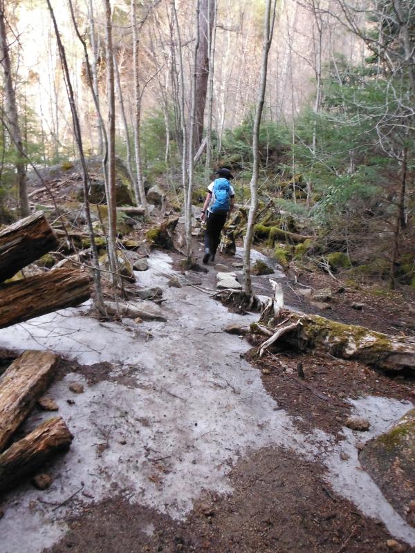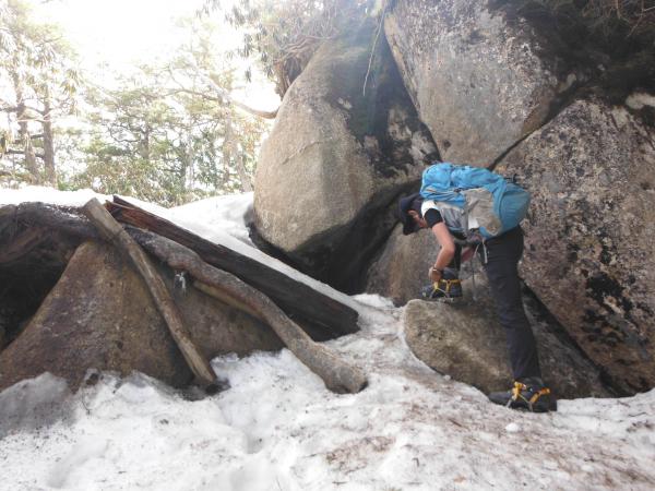 また「天鳥川へ降る斜面/山頂手前の登り/直下のコル(黒森分岐)から山頂の裏を巻く登り」の辺りは、特に登山道全体を氷が覆って非常に滑る。