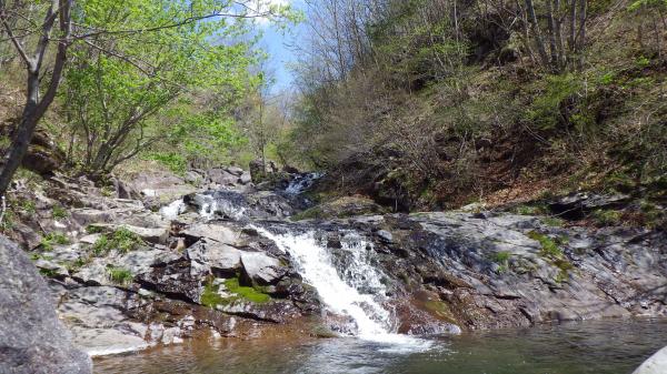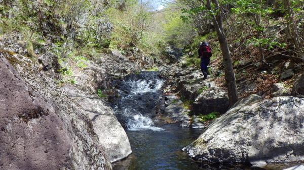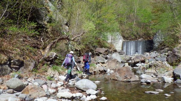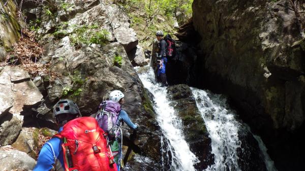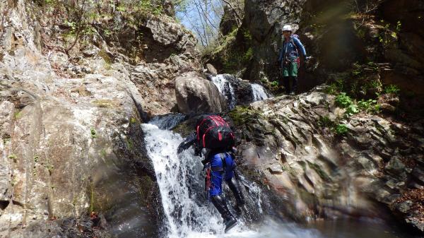 - 折場橋から見える堰堤を巻いて進むとすぐに滝が出てきます。ただ滝と言っても小さいのでザイルも必要なく初心者でも簡単に登れます。ルートは基本的に小滝の連続です。