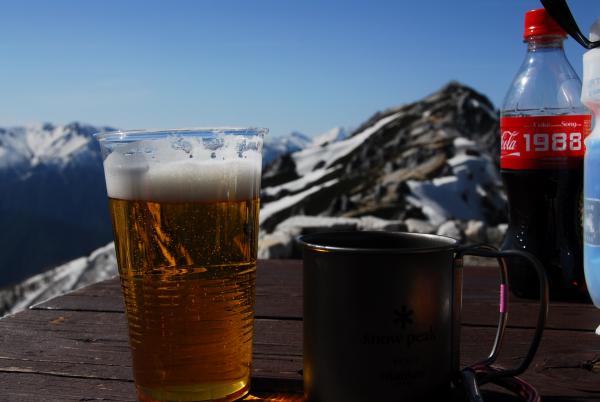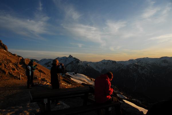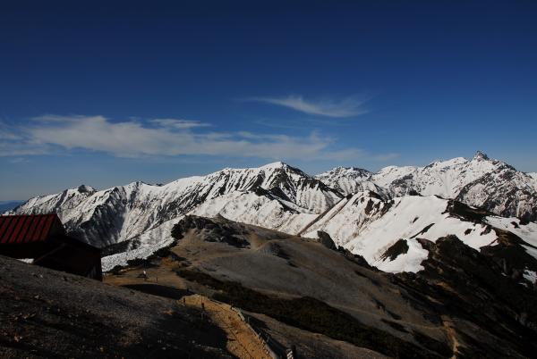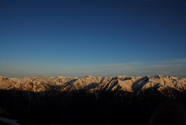 快晴で無風。小屋の前のテラスからは北アルプスが一望できて、