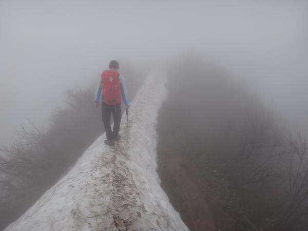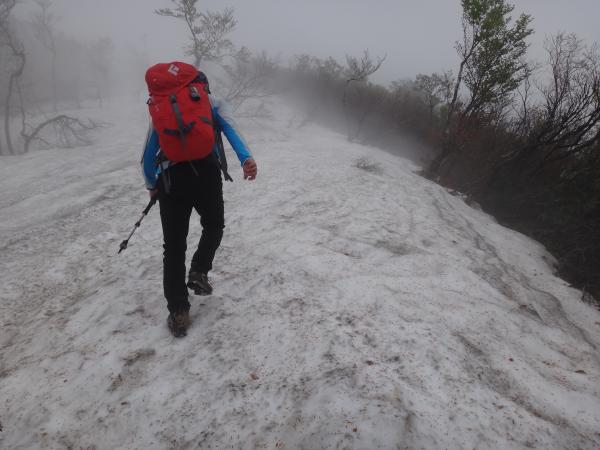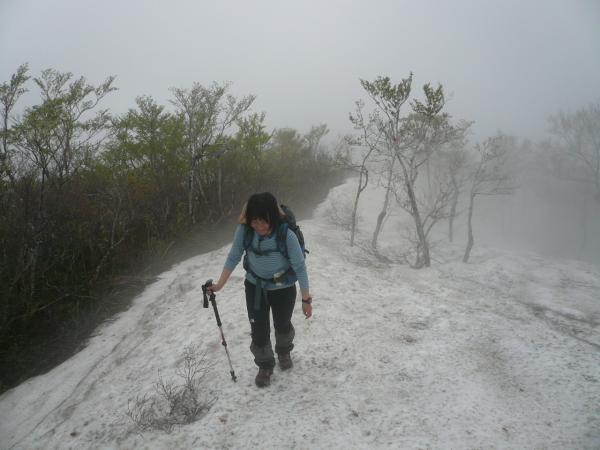 七合目辺りから残雪が深く、細い雪の稜線を慎重に一歩一歩進みます。展望が無いのでまるでカルピスの中を進むようです。