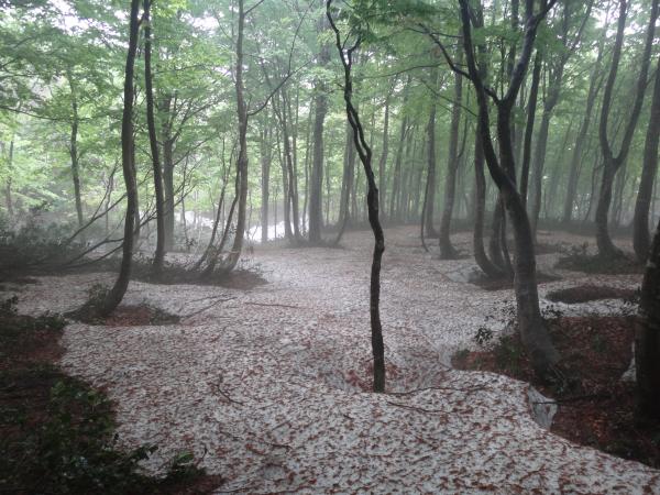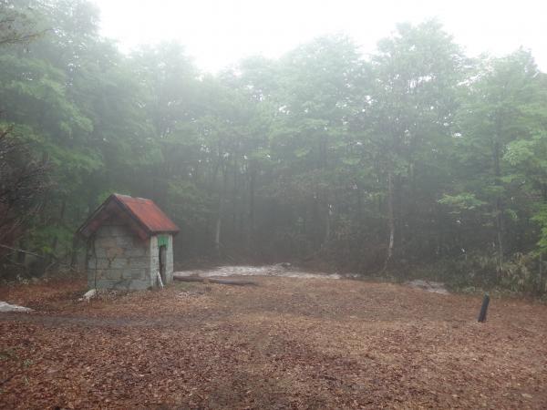 避難小屋のある粟薬師を過ぎると幻想的な風景が広がっていました。溶けた雪が霧となって残雪のブナの森を漂っています。この日は展望はありませんでしたが、この景色を見ることができたので大満足です。