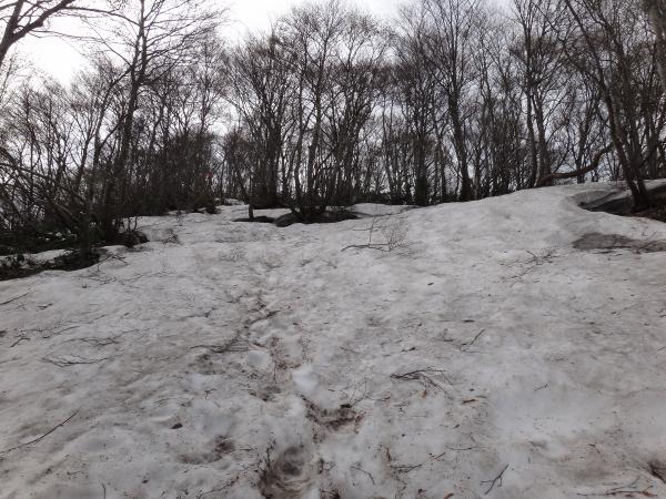 三差路に到着、右へ進めば三ノ峰を通って下山となりますが、左(松平山方面)へ向かって五頭山頂を目指しました。10分ほど登り、ピークらしい場所に着いたはずですが標識が見つかりません。ひょっとしてまだ埋もれているのでしょうか?雪が溶けたらまた確かめに来たいと思います。