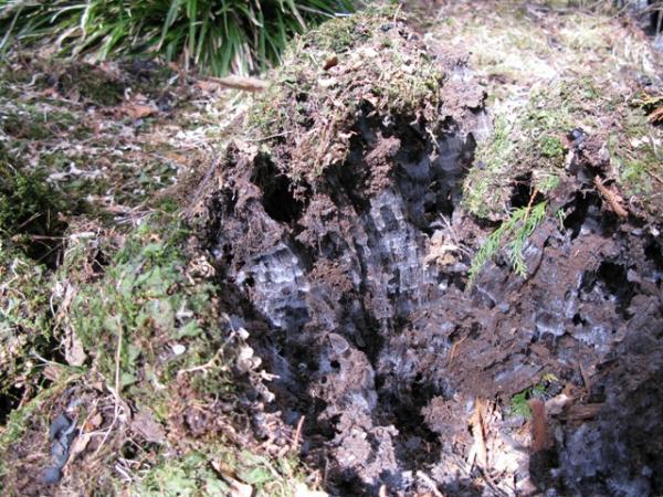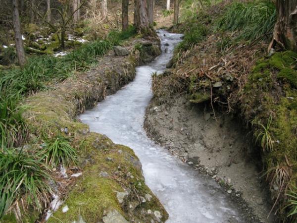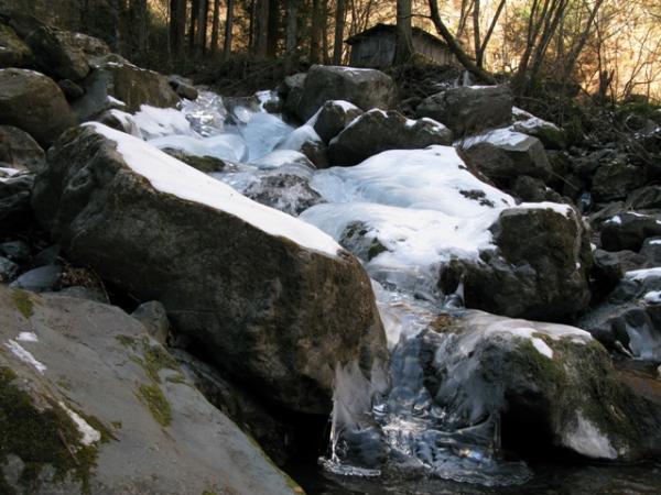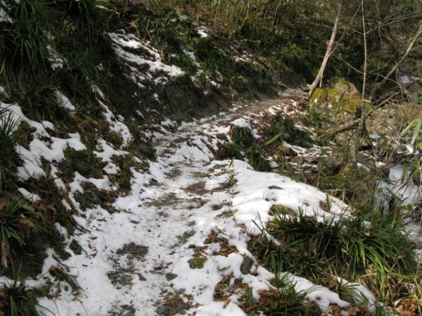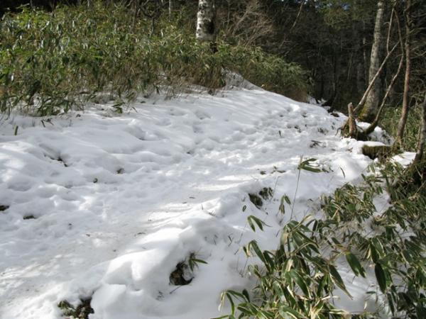 ただし、水場やわさび田の付近では登山道にあふれた水が凍結し