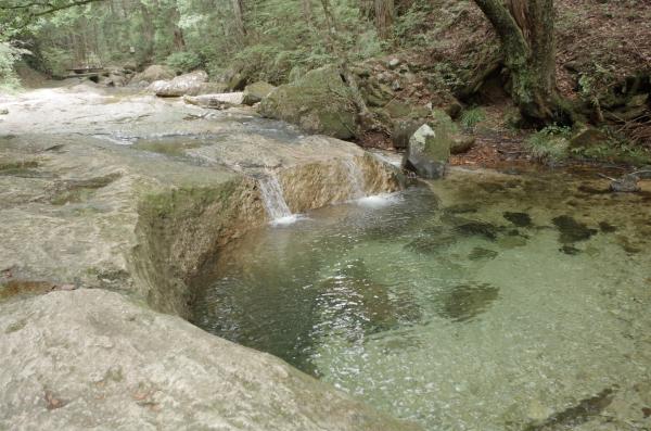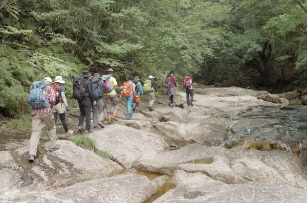 スタートは河原の岩棚から。滑るので足の置き方、体重移動に注意した。