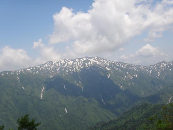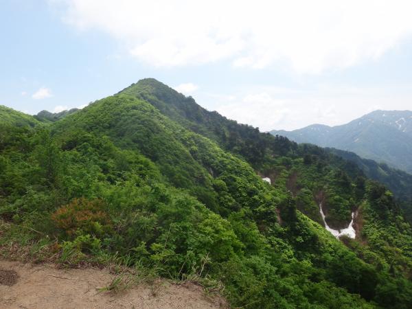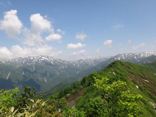 頂上に辿り着き焼峰ノ頭まで行くと、残雪の二王子や飯豊連邦の大パノラマが迎えてくれます。