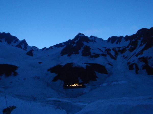 北穂高へは朝5時に出発。気温-5度。雪がまだ締まっていてアイゼンが効きます。ルートは昨日ヒュッテで確認しましたが、足跡がいっぱいあるので、比較的新しそうなものを選んでついて行く事に。しかし途中でかなりの急斜面地帯に突入しそうになったので、トラバースして他の足跡を追跡しました。汗