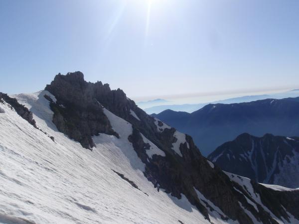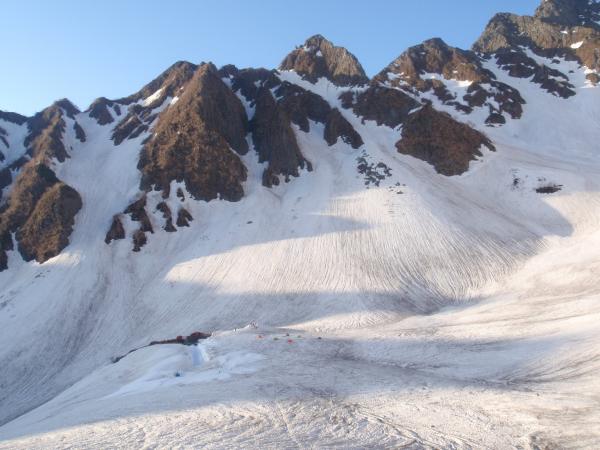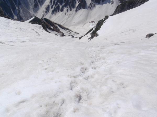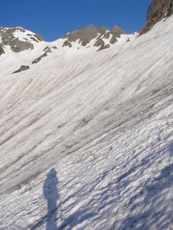 雪も腐ってくるので、ズルッと滑らないように注意です。北穂の直下は急斜面でかなり高度感があります。ピッケルを深く差して確保します。