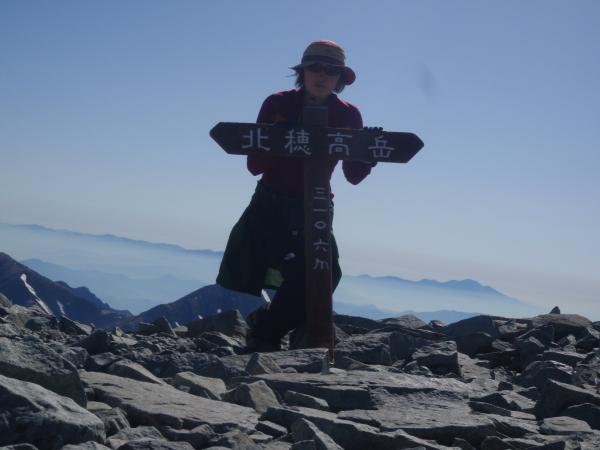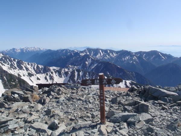 北穂の南峰と北峰の間のコルに突き上げるように登り詰め夏道を登れば北穂頂上!槍ヶ岳や笠ヶ岳、遠く富士山まで見えました。