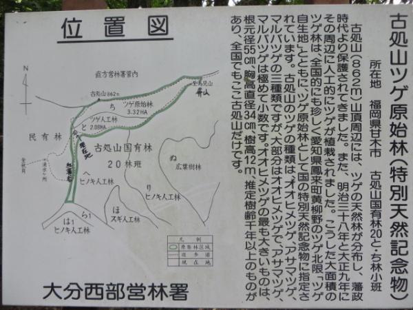 - 古処山登山口駐車場(30分)5合目駐車場(30分)水舟(2分)ツゲ原始林分岐(15分)縦走路出合(5分)奥の院・大将隠し分岐(10分)古処山山頂(7分)ツゲ原始林分岐(50分)古処山登山口駐車場 *歩行時間のみ