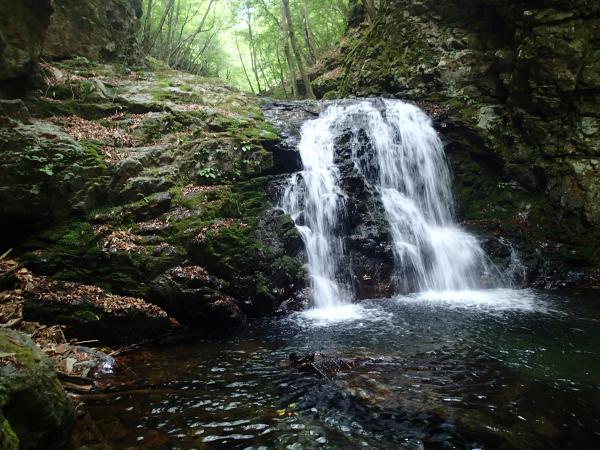 再び原生林のきれいな渓相を沢歩きしながら進むと魚止めノ滝が現れる。
