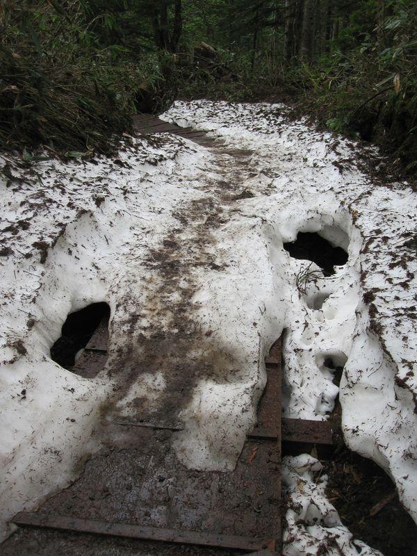- 天気が晴れていても木道がとても滑りやすいので、靴はグリップの効いた登山靴をおすすめします。見晴~三平峠あたり残雪が木道にもあります。また雪解けの土交じりでぐちゃぐちゃになるので、ゲイターがあると安心です。特に危険個所はありません。