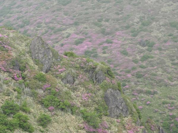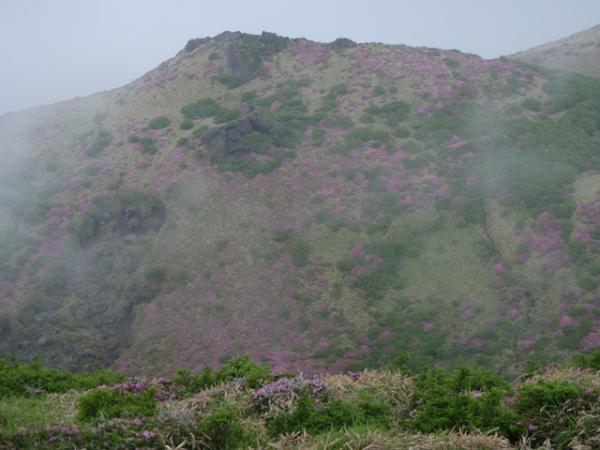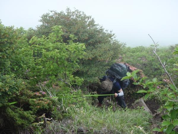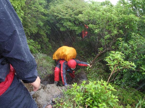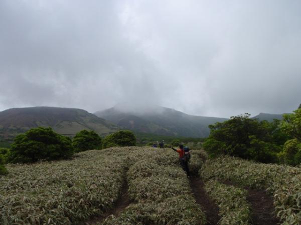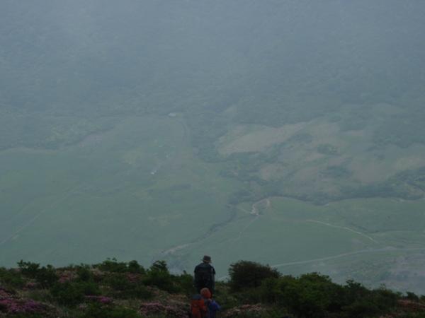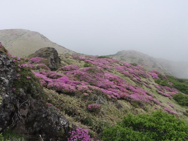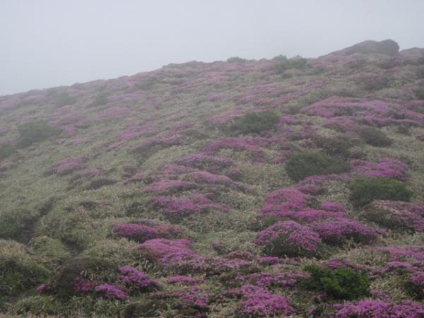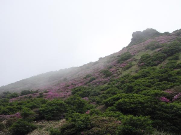 1日目は、昼まで曇りでしたが、午後から大雨になり、場所によっては川のように水が流れてました。三俣山からボウガツルへのルートは健脚コースですので、初心者の方は他のルートをお勧めします。急すぎてロープを出すところが何か所かありました。三股山の斜面のミヤマキリシマは、とてもきれいでした。ガスがかかって、見えたり見えなかったりですが、その景色もきれいた。