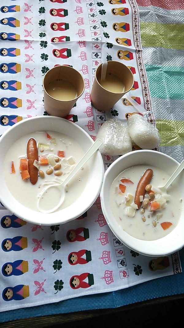 今回は初めて調理をしました。野菜のコンソメミルクスープ、豆乳クエン酸ヨーグルトです!