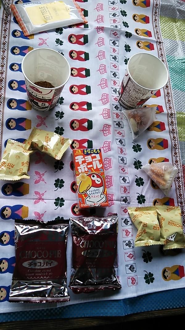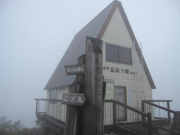 山頂は11時の時点で誰もおらず貸切状態。景色は全く見えず、気温は12.5度。風が強く、避難小屋での食事タイムです。