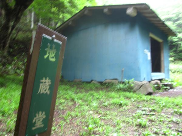 「地蔵堂」までの道のりは、沢転落注意の看板もありましたがそれほど水たまりもなく、予定通り通過。霧と霧雨で少し体が濡れてきました。