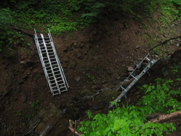 「地蔵堂」から「弘法の水」までに、滑落の跡と思われる現場があり、斜面に階段が取り付けてあるのですが、濡れていて滑りやすく危険でした。傾斜角度も急ですので、足元をしっかり見て、手すりをしっかり持ちました。
