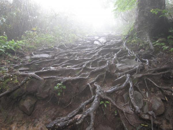 「氷ノ山山頂」まで2.5キロを切ると、斜面に木の根っこが広がってできている階段のような登りが続きます。こちらも雨の影響で滑りやすくなっていました(晴れている日はわかりませんが)。