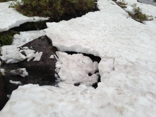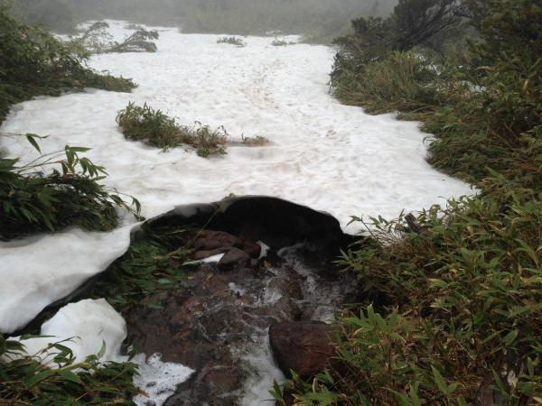 また雪渓には氷化した箇所もあり、傾斜の急な箇所では滑落しないよう注意が必要です(特に黒岳七合目からの登りとヒサゴ沼周辺の雪渓)。軽アイゼン・ストック、場合によってはピッケル持参が無難でしょう。またお昼過ぎからは踏み抜きに注意。