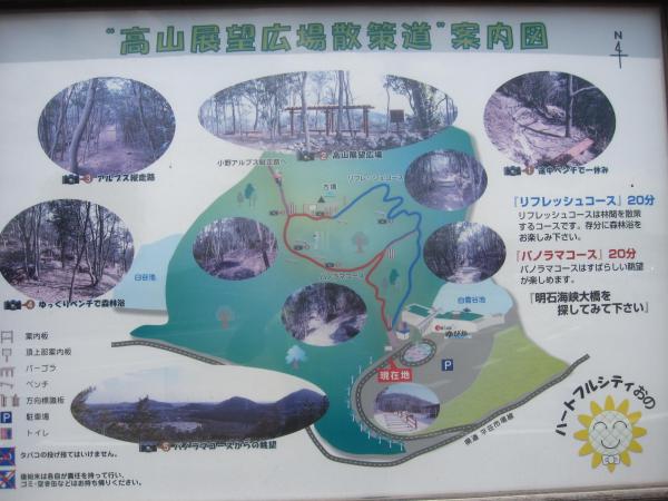 - ゆぴか高山登山口(20分)前山-愛宕山-安場山(20分)アザメ峠(10分)東コース入口(5分)きすみの見晴らしの森(10分)アンテナ山(8分)惣山(20分)紅山(5分)夫婦岩(20分)鴨池キャンプ場(40分)常光寺(10分)NTT中継所(15分)ゆぴか