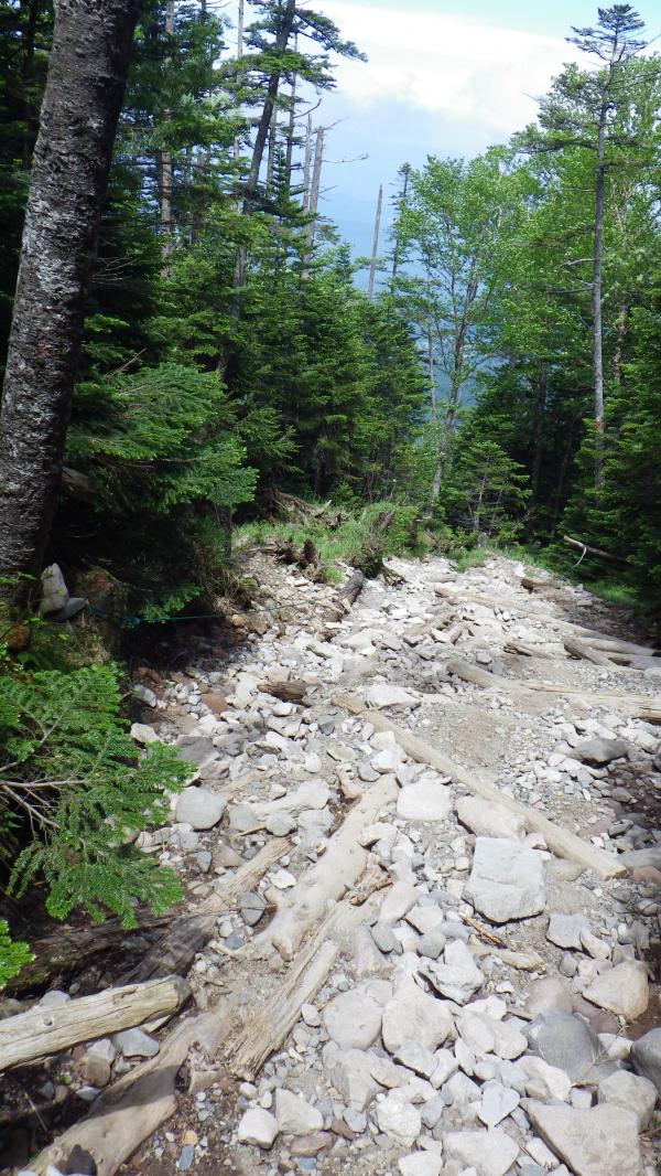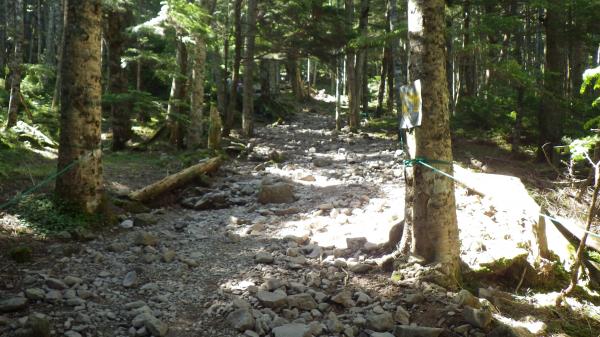 - 蓼科山荘までずっと林間を歩いて行く。傾斜もさほどきつくなく歩きやすい。石がゴロゴロの道では下りの時にズズーっと何度か足をとられた。蓼科山荘から頂上までは大きな岩をよじのぼっていくコース。山荘でストックをしまってから登ると良い。