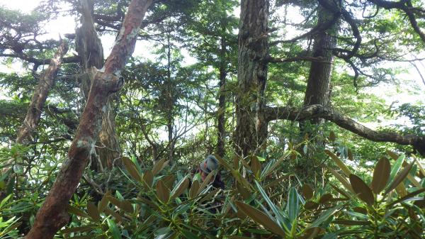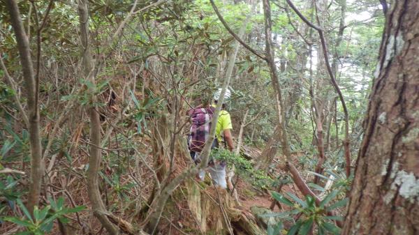 沢から上がり尾根に乗るとシャクナゲのヤブです。踏み跡が意外としっかりしているのと尾根の形が明瞭なので、岩峰を越えるまでの道は迷うことはないと思います。