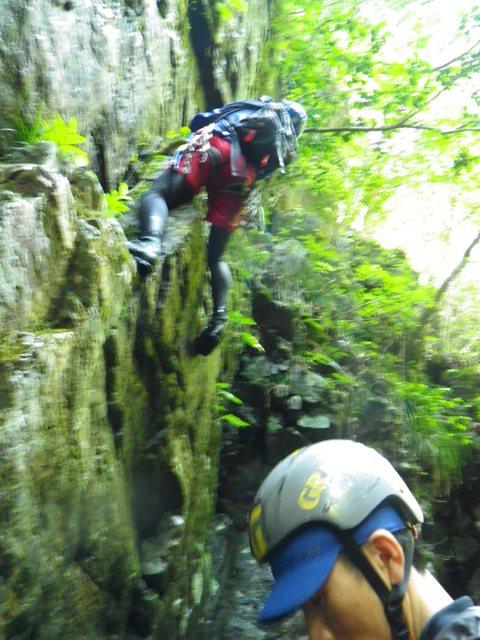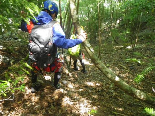 その中でも特に難しいのは、6m滝を越えた先の7m滝。滝身には太い倒木がよりかかっているものの、ほとんど登るのに使えません。かといって巻き道もなく、右岸のバンドを利用して越えますがこれがかなりバランスが悪い。直径4cmくらいの細い灌木を起点にしてバンドに立ちこみ、ジリジリとバランスを崩さないように進みます。私は大滝の登攀より難しく感じました。