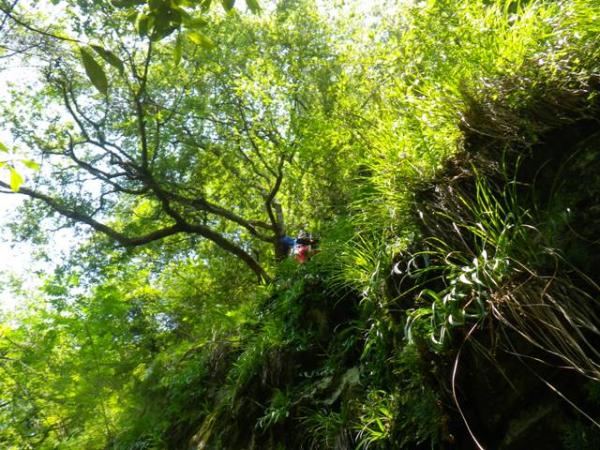 2Pは苔生した壁を灌木を頼りに登るクライミング。「灌木を頼りに」とは言うものの、部分的にしか使えず、傾斜が強いこともあってここも緊張しました。奮闘的です。