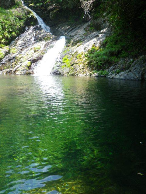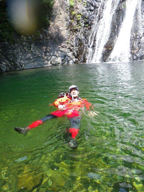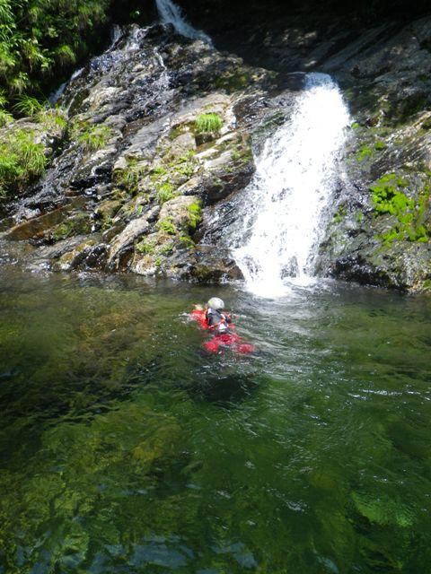 大量に汗をかいたので、抜けた先の30m滝の釜にすぐ飛びこみました。沁みわたります。