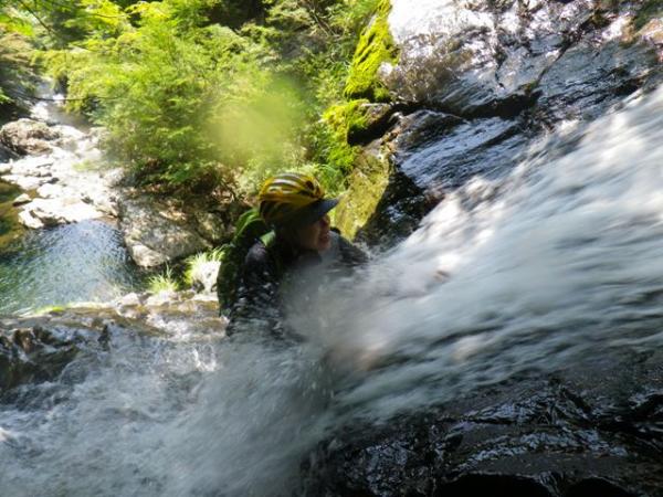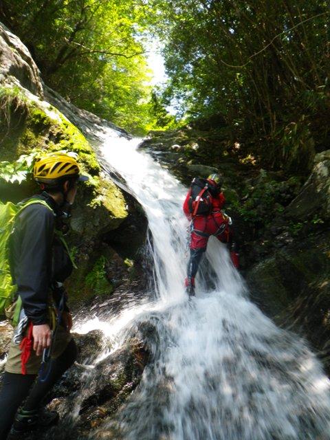 30m滝を高巻きしたあとは快適な釜泳ぎとシャワークライミングが続きます。水はキレイで冷たすぎもせず、もう最高です。これが滝を登ったご褒美というものでしょうか。
