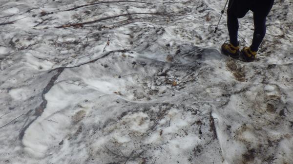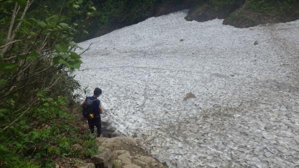 2時間ほど歩くと、荒菅沢の雪渓が出てくる。雪渓はひんやりと固くしまっていて、歩きやすかった。私たちは、見上げる景色に感動しながら歩いていたので道を少しだけ逸れてしまった。雪渓をよく見れば、通り道が黒く一直線に延びているので本当は間違えるはずもないのだが、念のため注意。