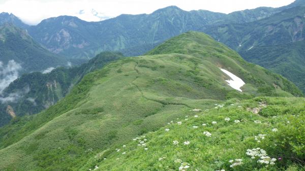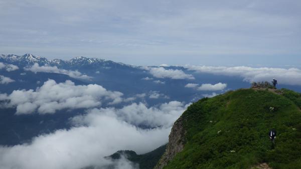 そこからの林間では、きのうの雨のためか?もともとなのか?褐色の粘土状の土が露出していて、時々ズルっと滑った。雪渓の前に比べて斜度があがり、時間経過と共に陽も上がってきたので汗が噴き出してくる。これぞ夏山といった雰囲気。そして、視界が開けると火打山方面と糸魚川方面を見渡すことができる。これは結構感動もの。ハシゴや岩をよじ登りながら高度をぐんぐん上げていく。道の脇には高山植物が咲いていた。そして笹平。緑の丸い雨飾山と、奥に聳える北アルプスのコントラストが実に美しい。道沿いに咲き乱れるお花たちに、「天国のような場所だなぁ」と思った。