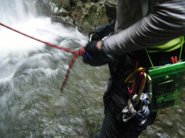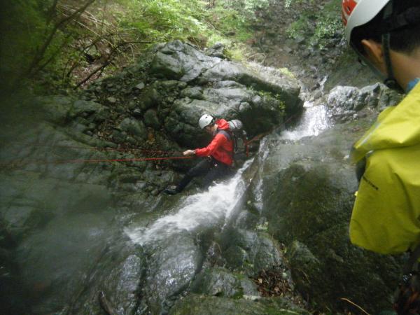 大平橋からは富士形ノ滝までを登り、富士形ノ滝では懸垂下降を実践。大事な技術です。帰りは沢を引き返し大平橋まで下りをしました。